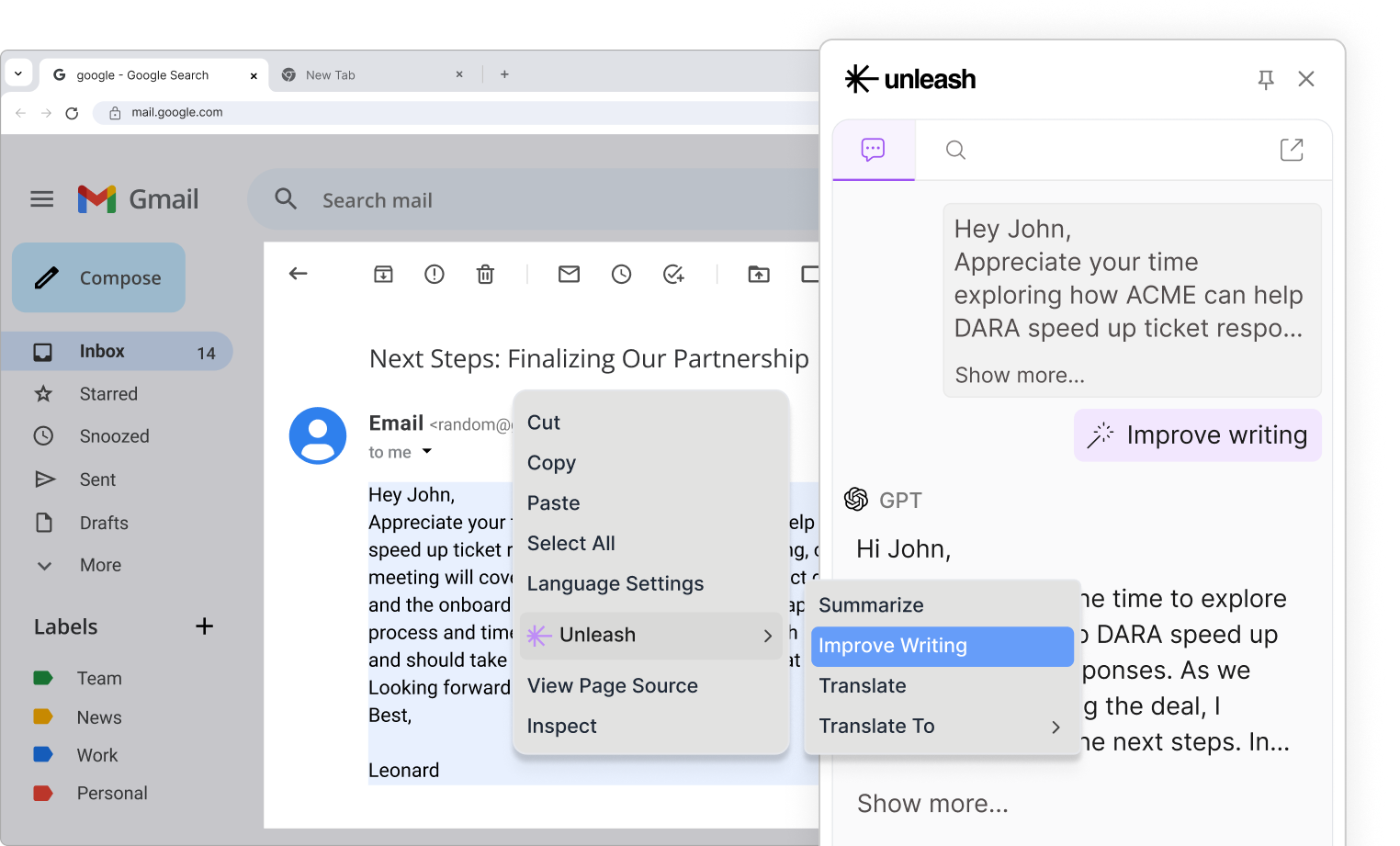 Access your company’s knowledge or leading LLMs - right from every tab you work in.